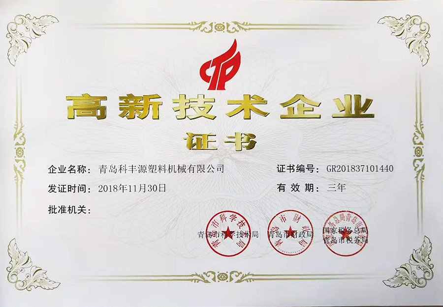青島科豐源塑料機(jī)械有限公司獲得高新技術(shù)企業(yè)證書(shū)